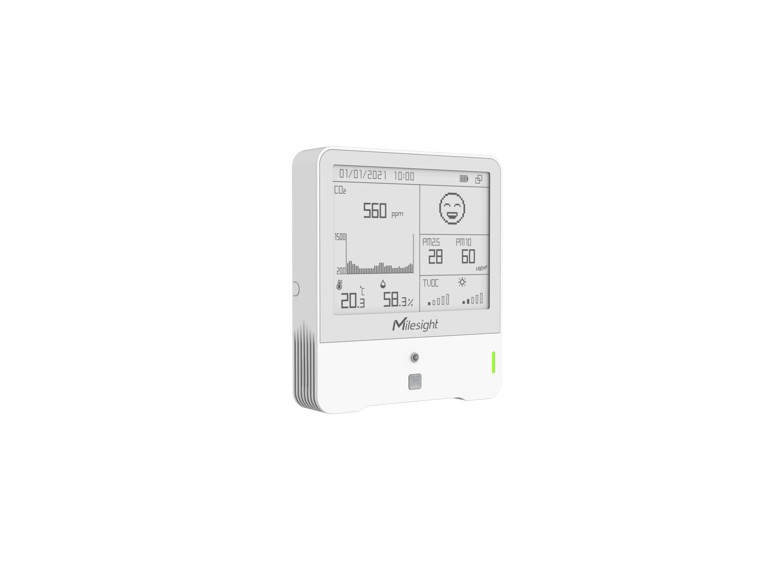 Together with a Milesight LoRaWAN gateway, the data can be viewed remotely. This is often used in offices, schools, or other buildings where air quality and energy use need to be monitored.