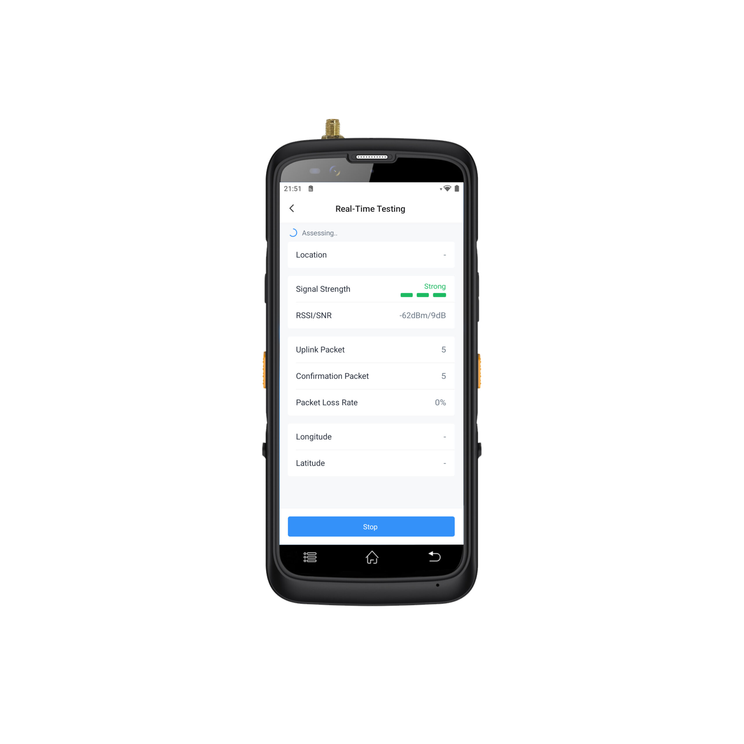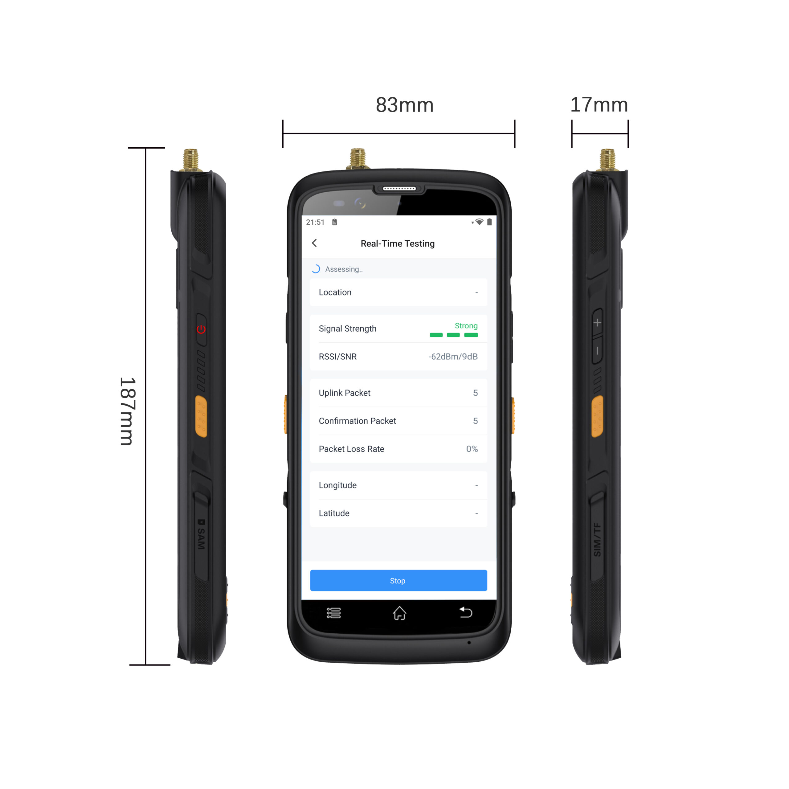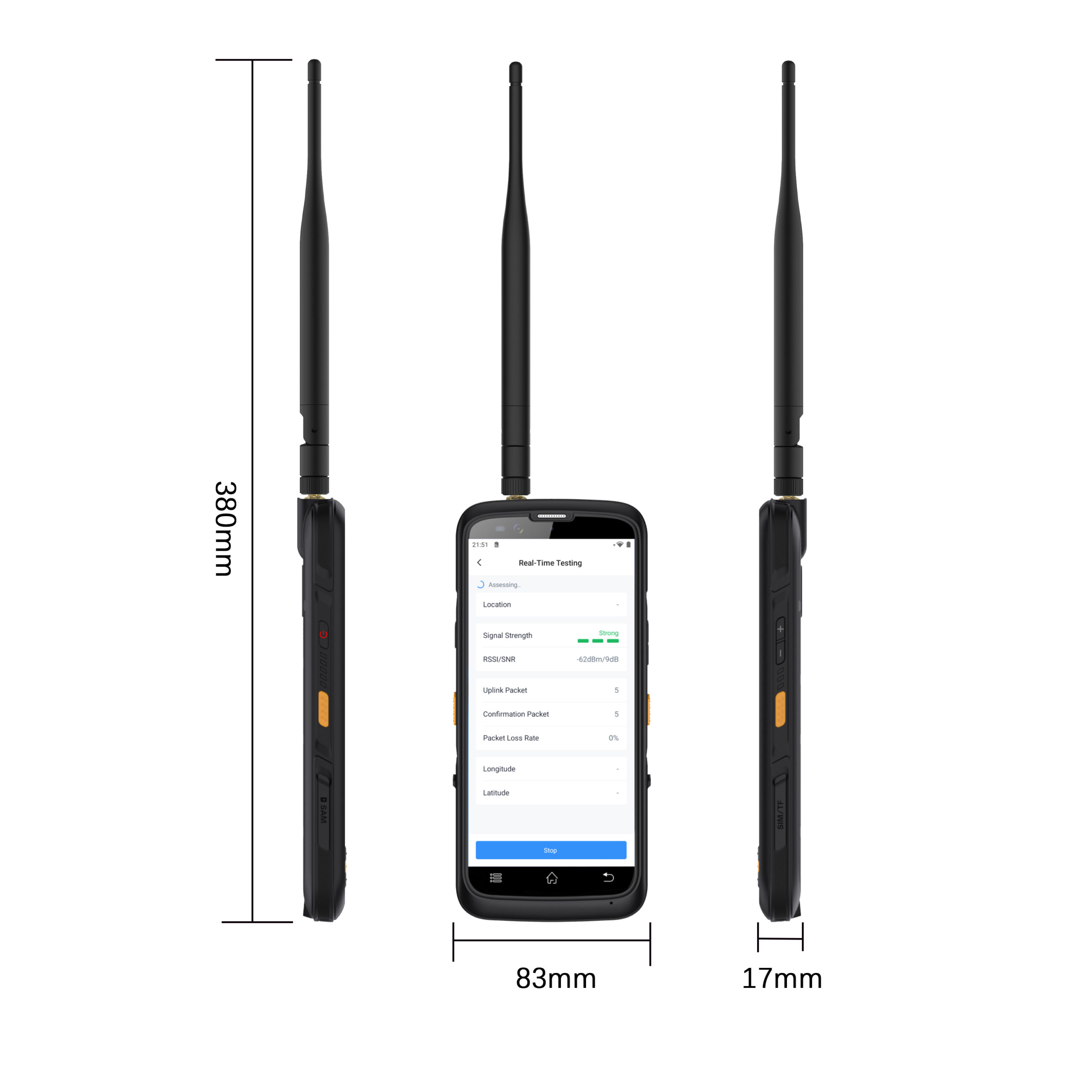 This tester includes a one-channel SX1262 LoRaWAN® module, supporting global frequency bands via interchangeable antennas. It allows users to run signal evaluations, perform noise scans, simulate device-to-gateway connections (ping-pong tests), measure packet loss rates, and monitor RSSI and SNR in real time.