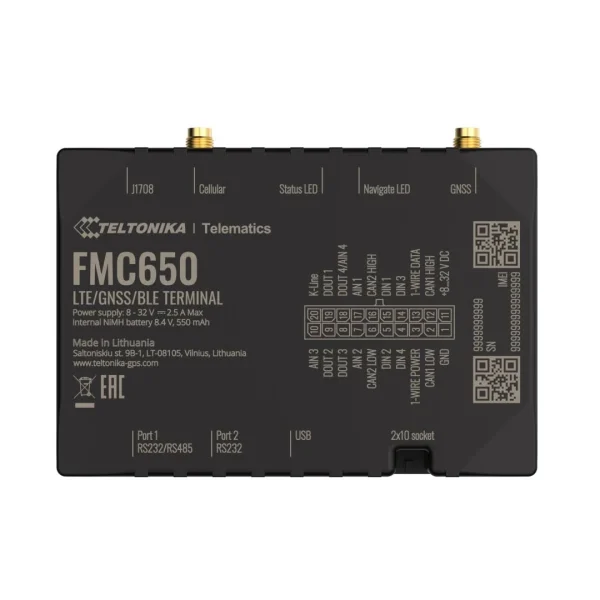 The Teltonika FMC650 is a 4G LTE Cat 1 tracker for advanced heavy-fleet applications, built for trucks, trailers, and machinery. It combines a high-capacity backup battery, external GNSS/LTE antennas, and rich interfaces (CAN, RS232/RS485, K-line) to enable remote diagnostics, tachograph data workflows, and scalable integration with external devices.