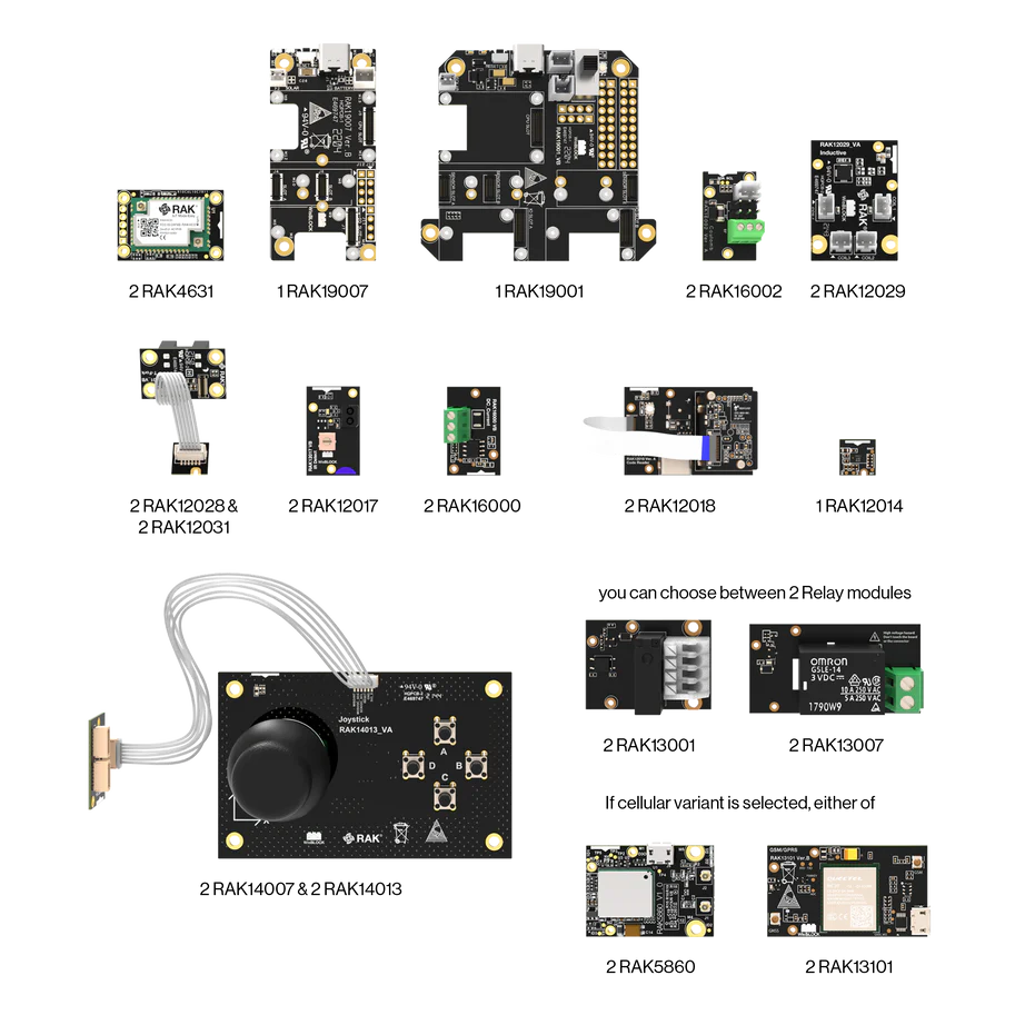 | Sensor Modules | 2 × RAK16002 Coulomb Sensor 2 × RAK12029 Inductive Sensor 2 × RAK12028/RAK12031 Fork Sensor 2 × RAK12017 IR Proximity Sensor 2 × RAK12014 IR ToF Sensor 2 × RAK12018 Barcode Scanner 2 × RAK16000 DC Current Sensor |